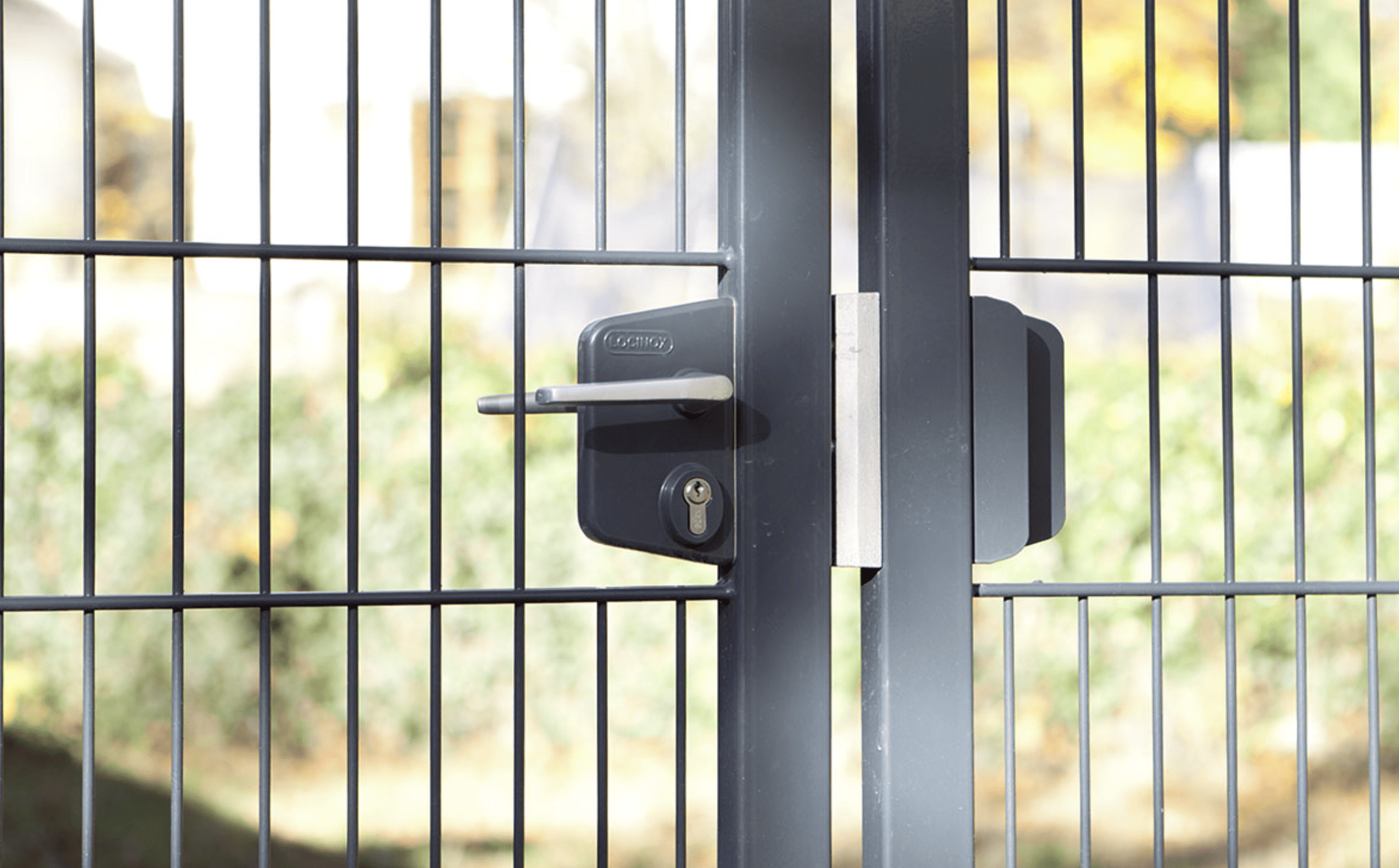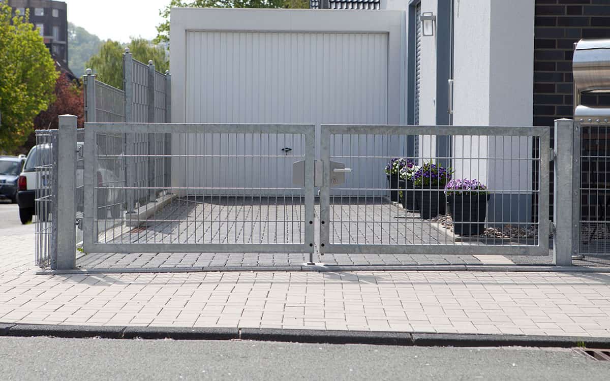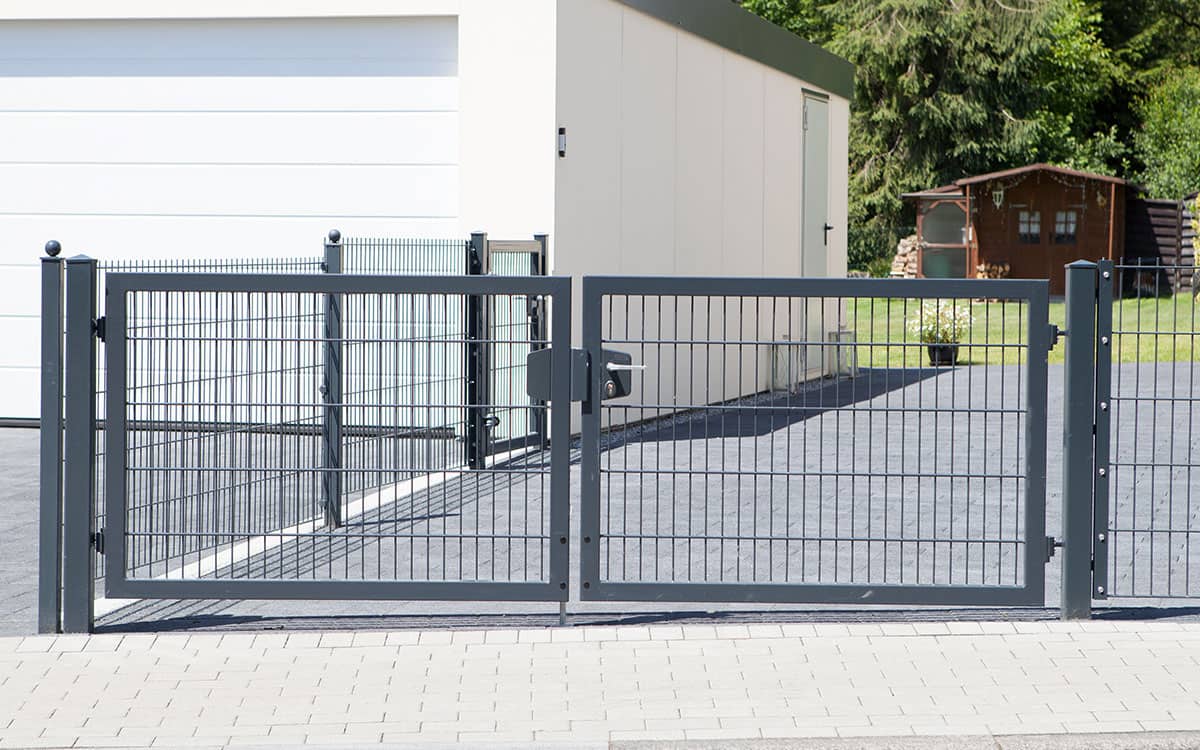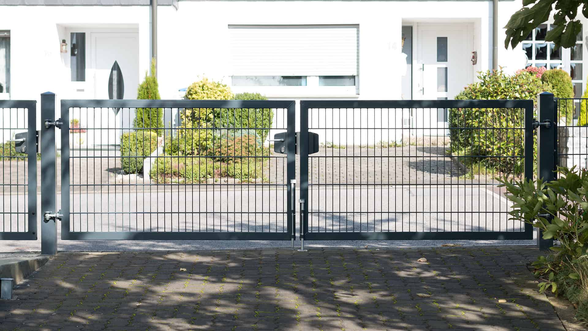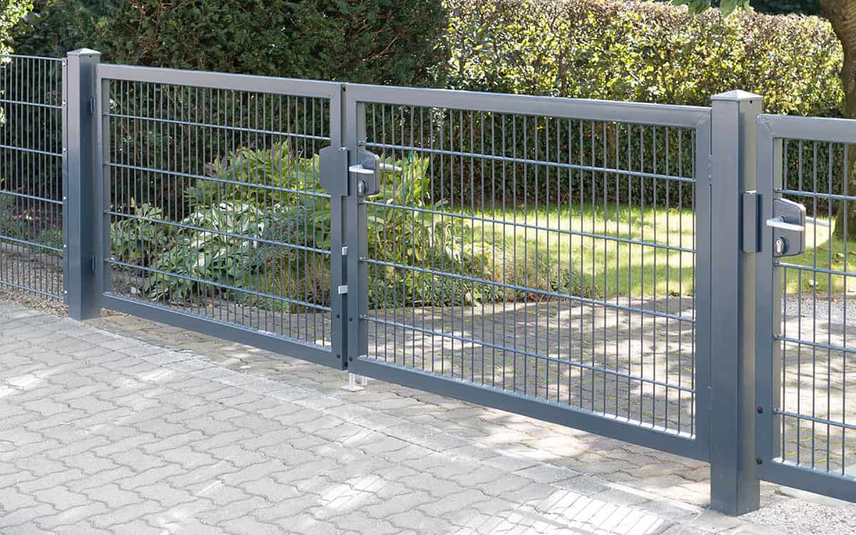 En stor, 6m dobbeltlåge med panelfyld 8mm og en robust Locinox-låsekasse i midten og understøttet af to robuste sidestolper.