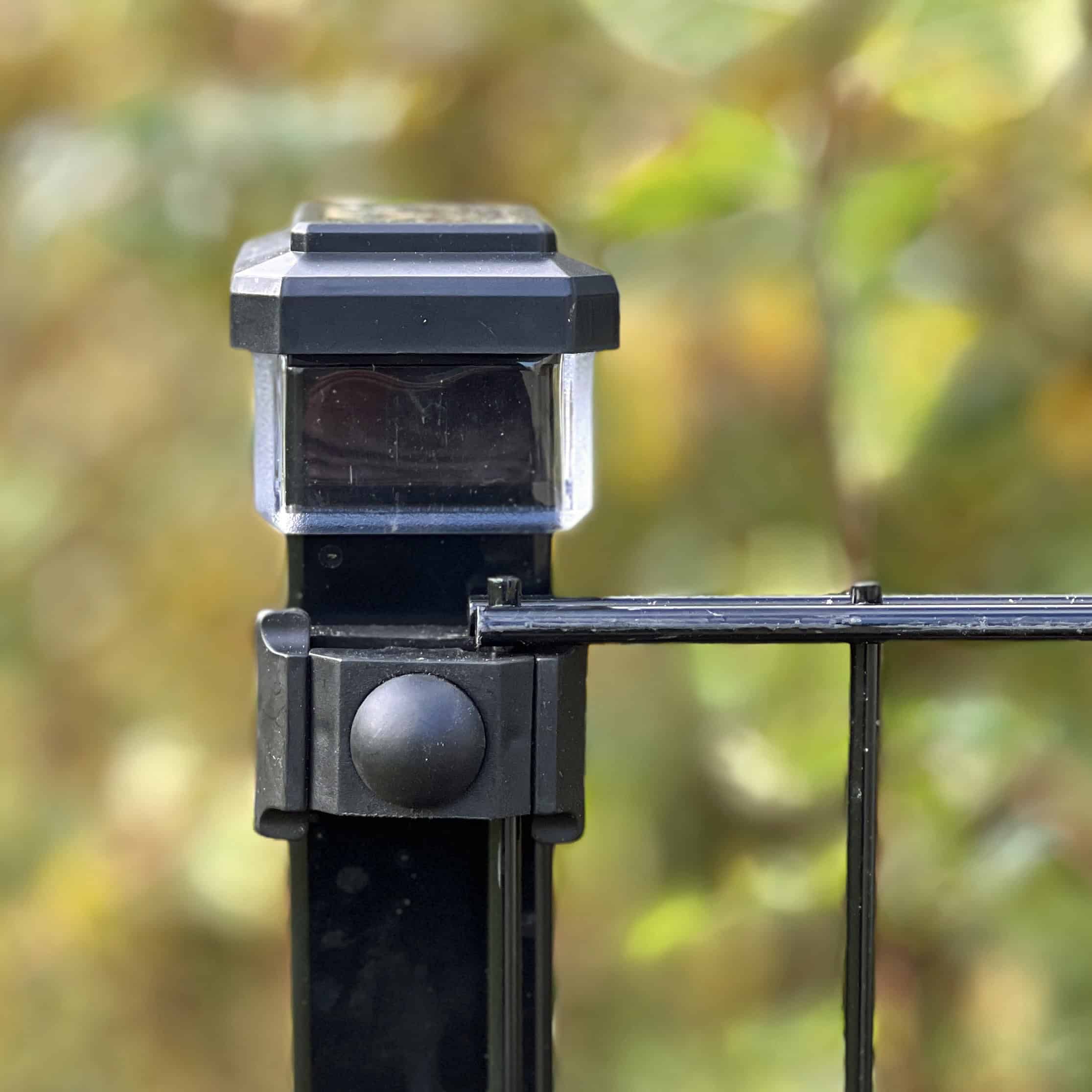 Nærbillede af en Solcelledrevet LED-lampe til Hegnsstolper i slank sort anbragt på en metalhegnspæl, blidt lysende mod en sløret baggrund af frodigt grønt løv.
