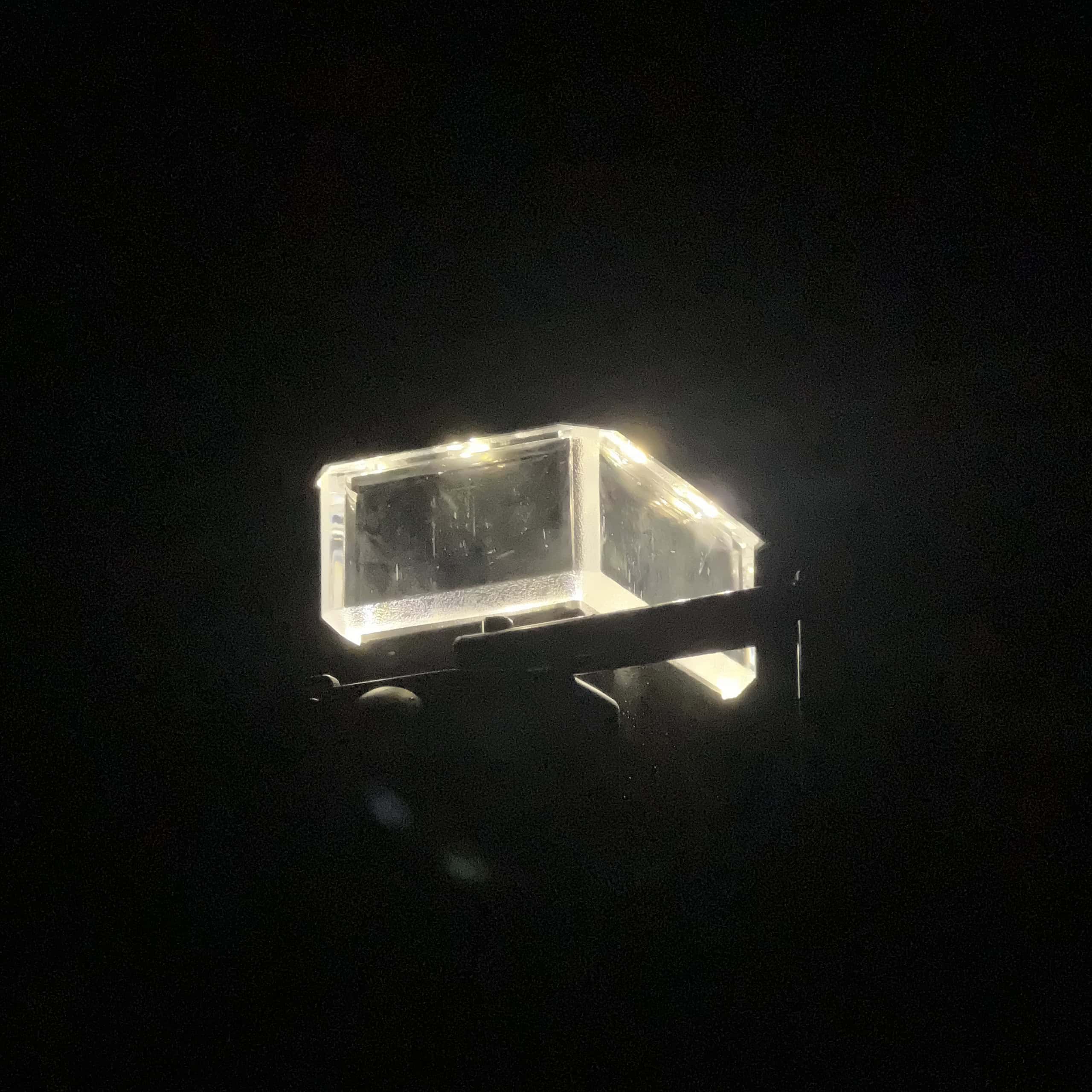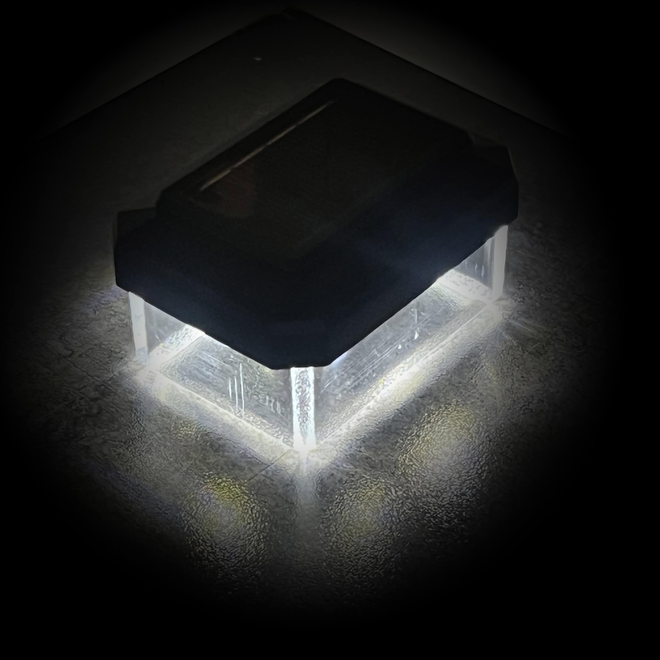 En lille rektangulær sort boks, der ligner en Solcelledrevet LED-lampe til Hegnsstolper, udsender et skarpt hvidt lys nedenunder, og kaster en oplyst refleksion på en mørk struktureret overflade. Den centralt placerede æske skaber en glorieeffekt omkring sin base.